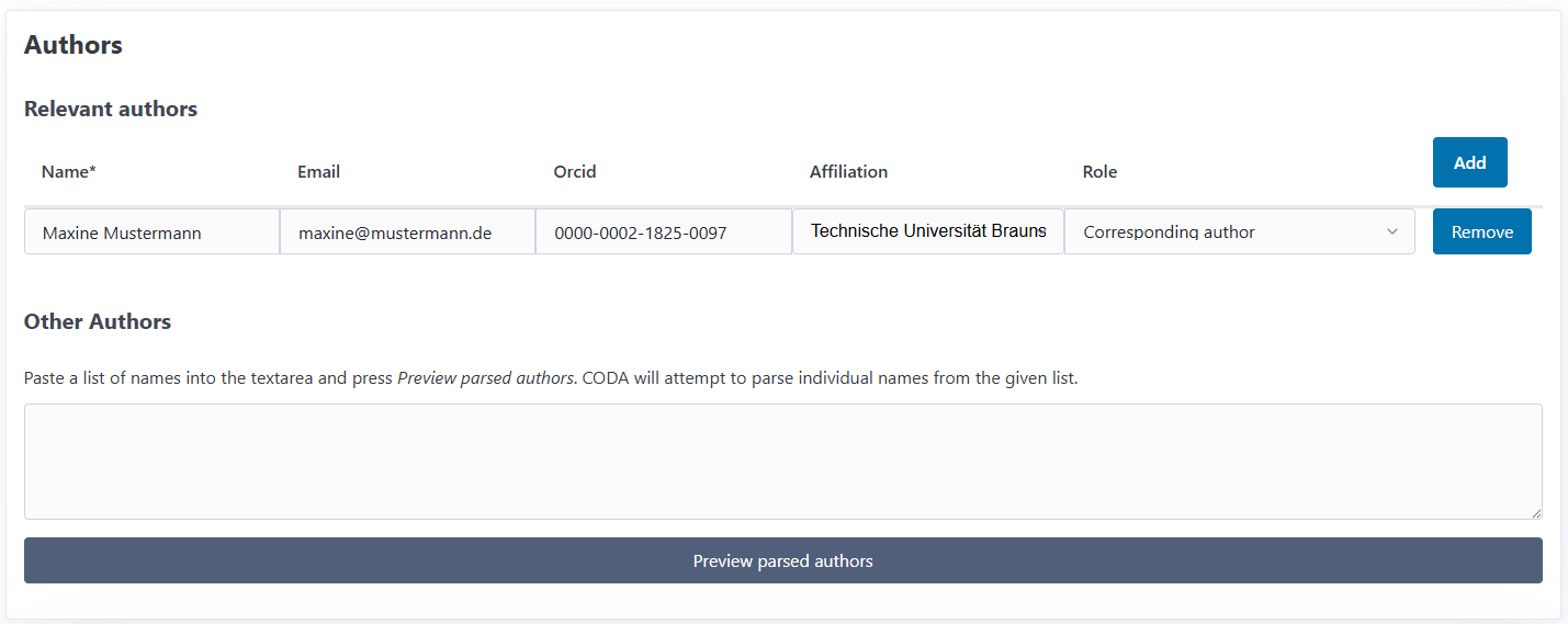 You can copy author information and paste it into the text area and let CODA parse the copied text to structured author data. This feature keeps author information that is not relevant for your process, for instance when many authors contributed, but only the corresponding author is interesting for you.