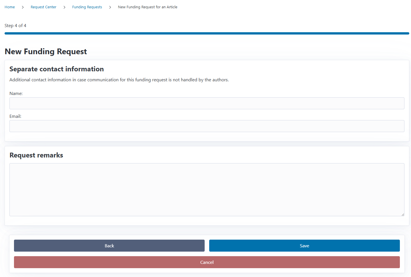 In this final step you can provide additional contact information regarding the funding request besides the authors information. You can also add notes and remarks.