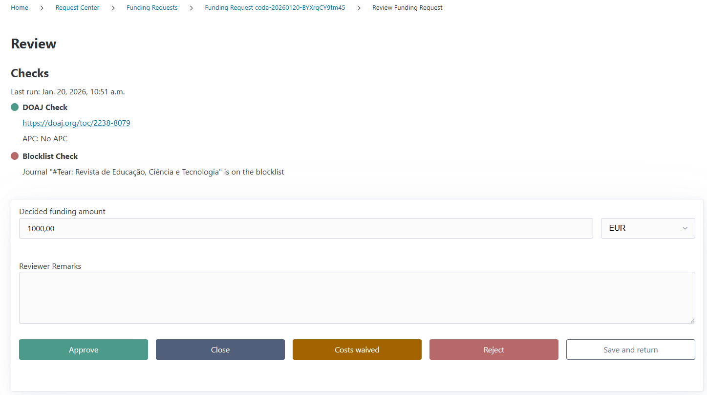 result: “open”, “approved”, “rejected”, “waived”, or “closed”decided_funding: Amount and currencyremarks: Reviewer notes
