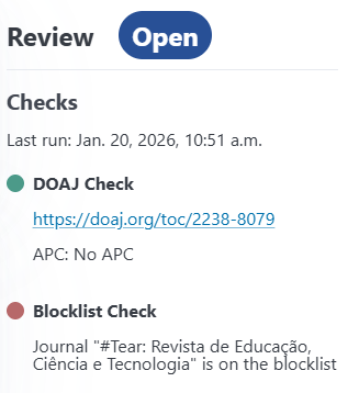 Blocklist Check: Checks if the journal or publisher is on your institution’s blocklist