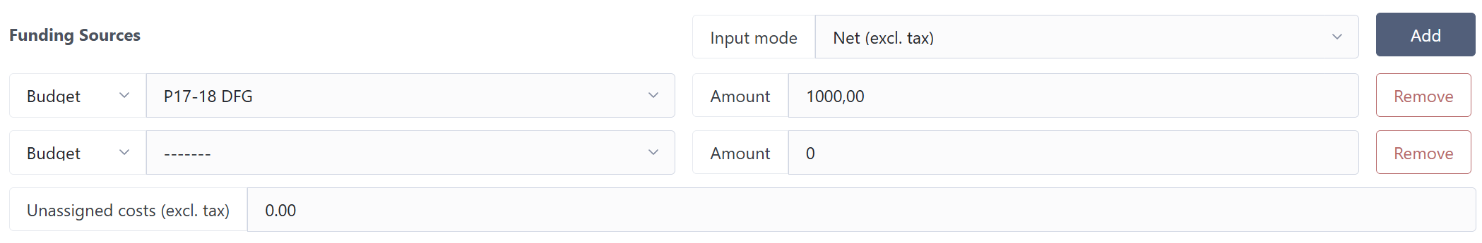 type: “budget” or “institution” (default: “budget”)name(required): Name of the budget or institutionamount: Specific amount assigned (optional - if omitted, remaining costs are split equally)