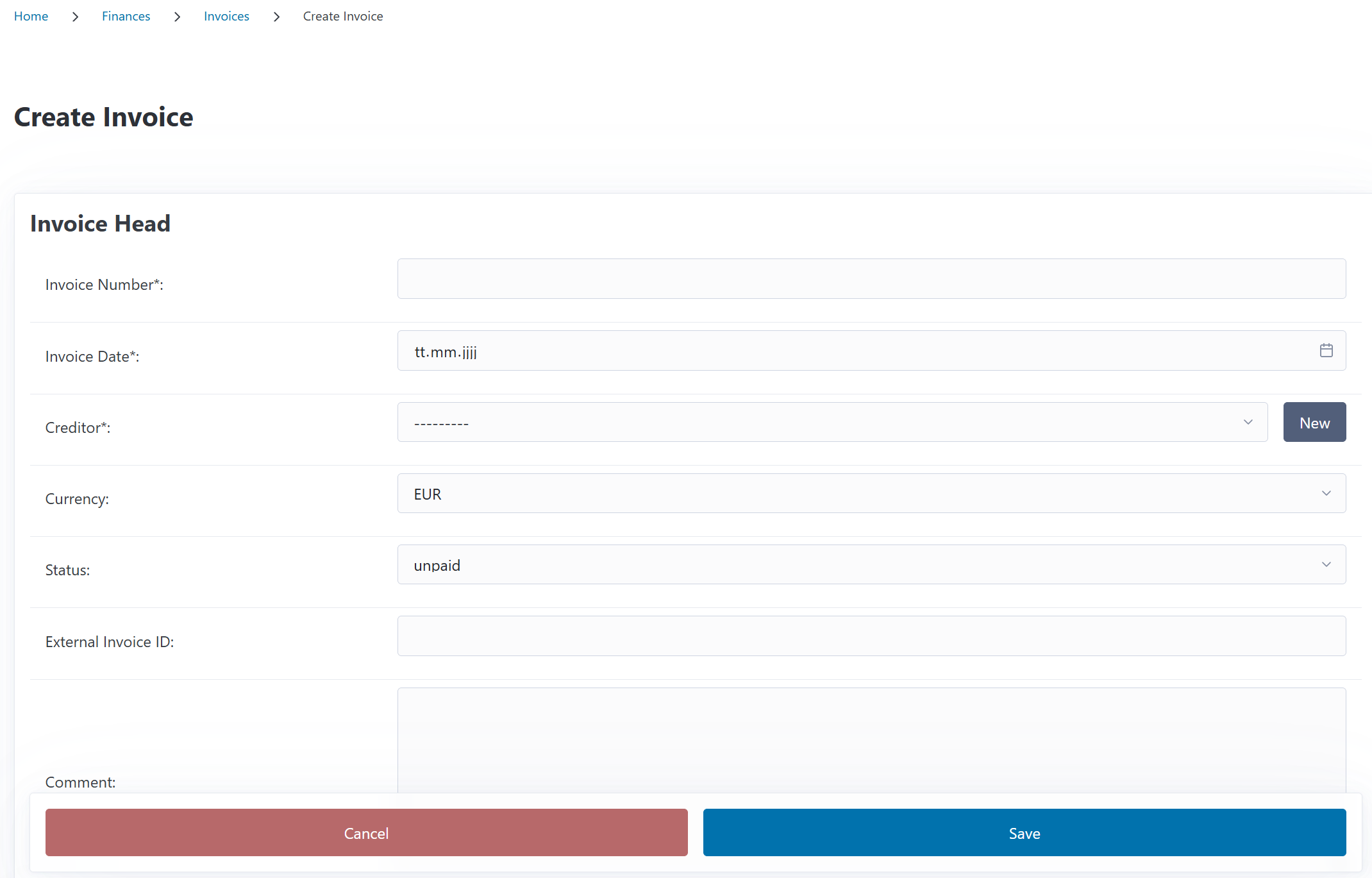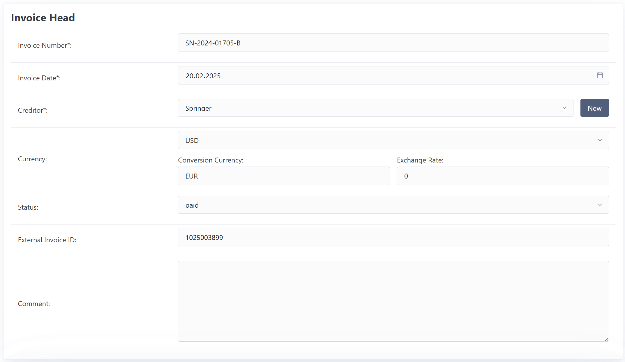 number(required): Invoice number as stringdate(required): Date in YYYY-MM-DD formatcreditor(required): Creditor name (auto-created if doesn’t exist)currency(required): Three-letter currency code (EUR, USD, GBP, etc.)status(required): “paid”, “unpaid”, or “rejected”external_id: External system reference IDcomment: Notes about the invoiceconversion: Currency conversion with target currency and exchange ratepositions(required): Array of position objects