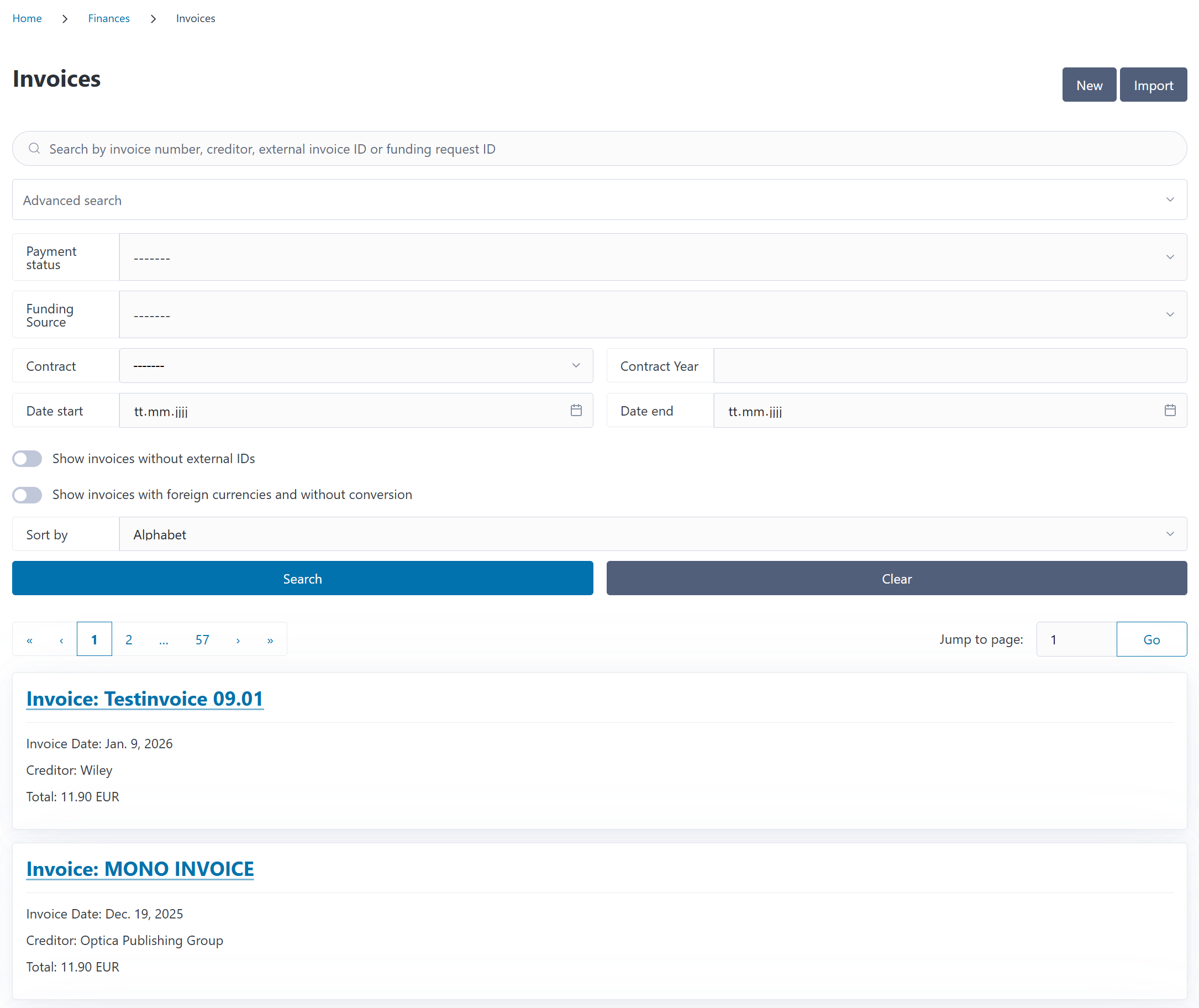 You can access invoices from the Finances section in the navigation menu. The invoice list shows all invoices in your system with their invoice numbers, creditors, dates, payment status, and total costs.